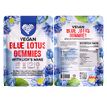 Nutrition Facts: Each mylar bag contains 20 gummies, offering two servings per bag, with each serving consisting of 10 pieces. These gummies contain 50mg of Blue Lotus extract each. Nutritional values per serving include 110 calories, zero grams of fat, 20 mg of sodium, 27 grams of carbohydrates, and 19 grams of sugar.