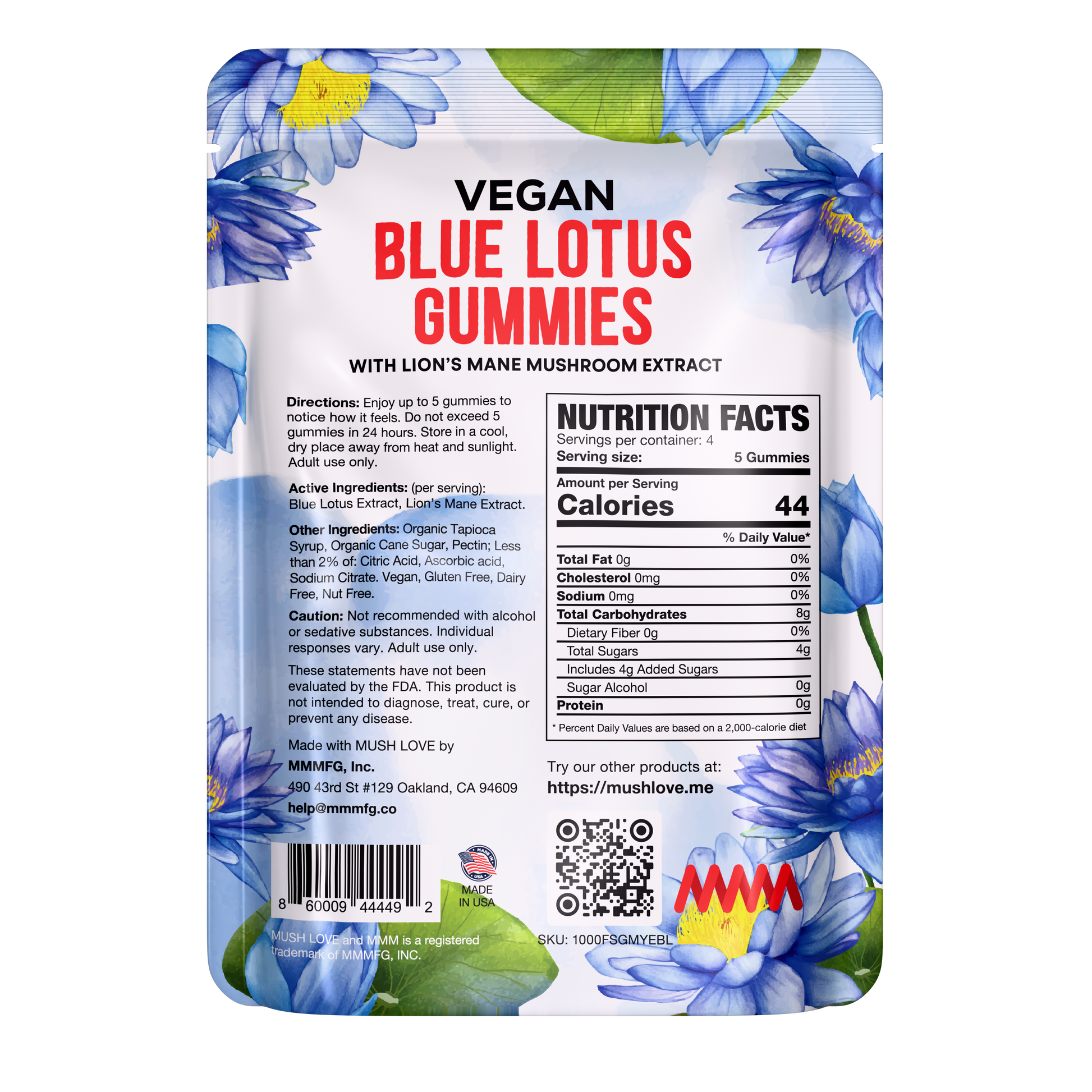 Gummy ingredients: Sucrose, tapioca syrup, kosher beef gelatin, Blue Lotus flower extract, Lion’s Mane extract, organic flavor extracts, ascorbic acid, and tartaric acid. Note: This product is not vegan but is kosher certified. Certificate of Kashruth available upon request.